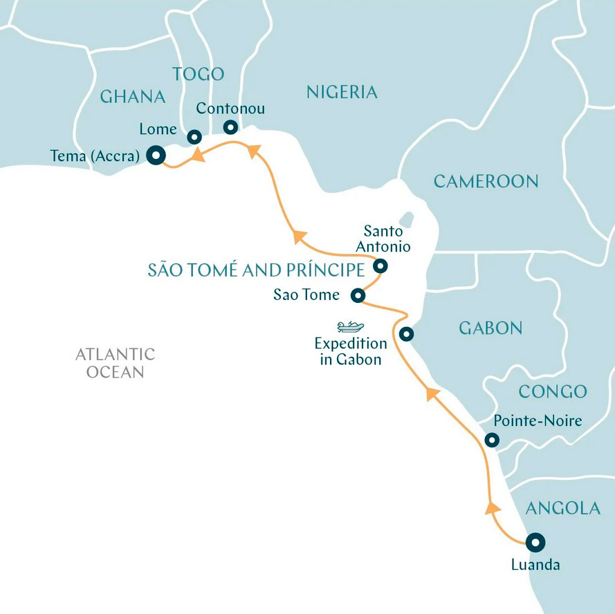 Луанда (Ангола) – Пуэнт-Нуар (Республика Конго) – Маюмба (Габон) – Национальный парк Лаанго (Габон) – остров Сан-Томе (Сан-Томе и Принсипи) – Санто-Антонио (Сан-Томе и Принсипи) – остров Кориско (Экваториальная Гвинея) – Малабо (Экваториальная Гвинея) – Котону (Бенин) – Ломе (Того) – Аккра (Гана)