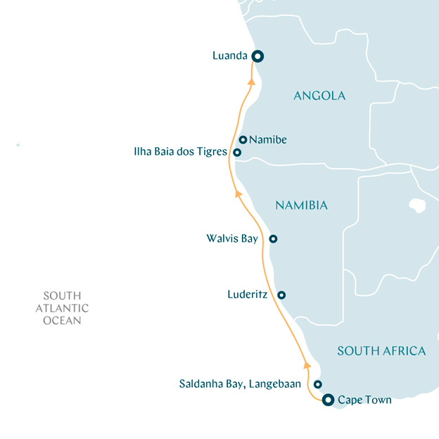 Маршрут круиза: Кейптаун (ЮАР) – Бухта Сальданья (ЮАР) – Людериц (Намибия) – Волфиш Бей (Намибия) – Илья-Байя-дус-Тигрес (Ангола) – Мосамедес (Ангола) – Луанда (Ангола)