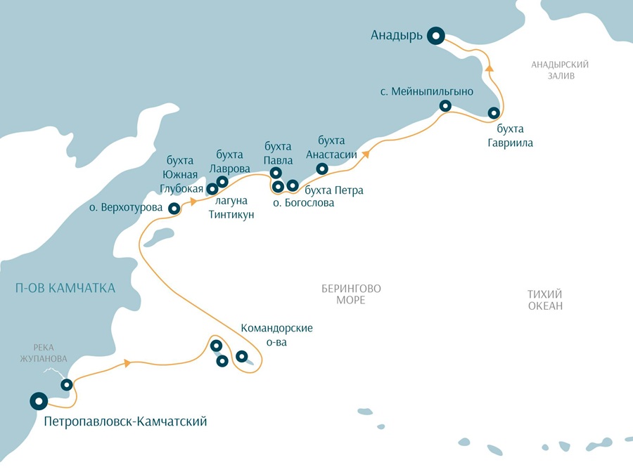 Петропавловск-Камчатский – река Жупанова – Командорские о-ва – о. Верхотурова – о. Богослова, Бухты Петра и Павла, бухта Глубокая, Лагуна Тинтикун – Бухта Анастасии – д. Мейныпильгыно – Бухта Гавриила – Анадырь