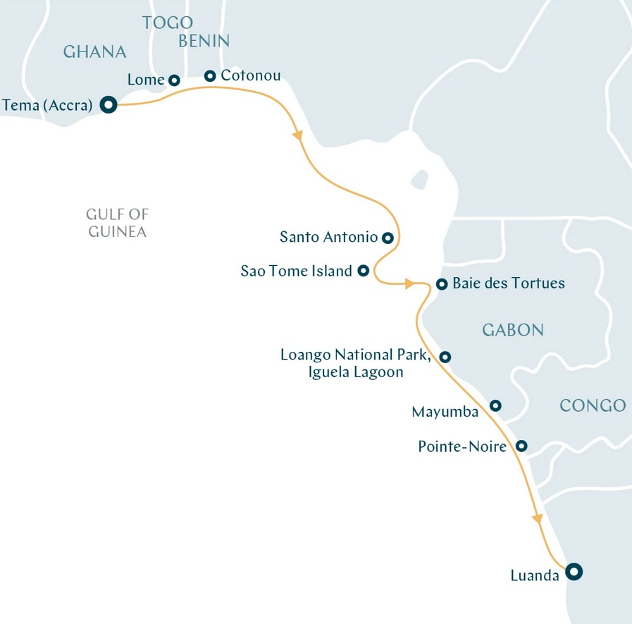 Круиз вдоль берегов Западной Африки по маршруту: Аккра (Гана) – Ломе (Того) – Котону (Бенин) – Санто-Антонио (Сан-Томе и Принсипи) – остров Сан-Томе (Сан-Томе и Принсипи) – национальный парк Лоанго (Габон) – Пуэнт-Нуар (Республика Конго) – Луанда (Ангола)