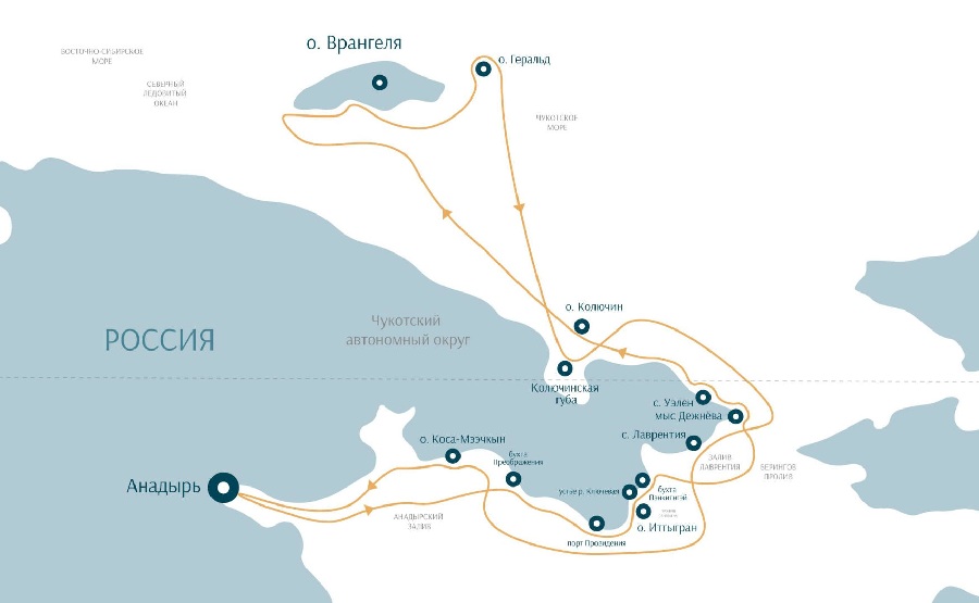 Анадырь – бухта Преображения – остров Иттыгран и пролив Сенявина – мыс Дежнева, Уэлен – остров Колючин – акватория о. Врангеля – о. Геральд – Колючинская губа – село Лаврентия – бухта Пенкигней, Сенявинские источники и пролив Сенявина – коса Мээчкин – Анадырь